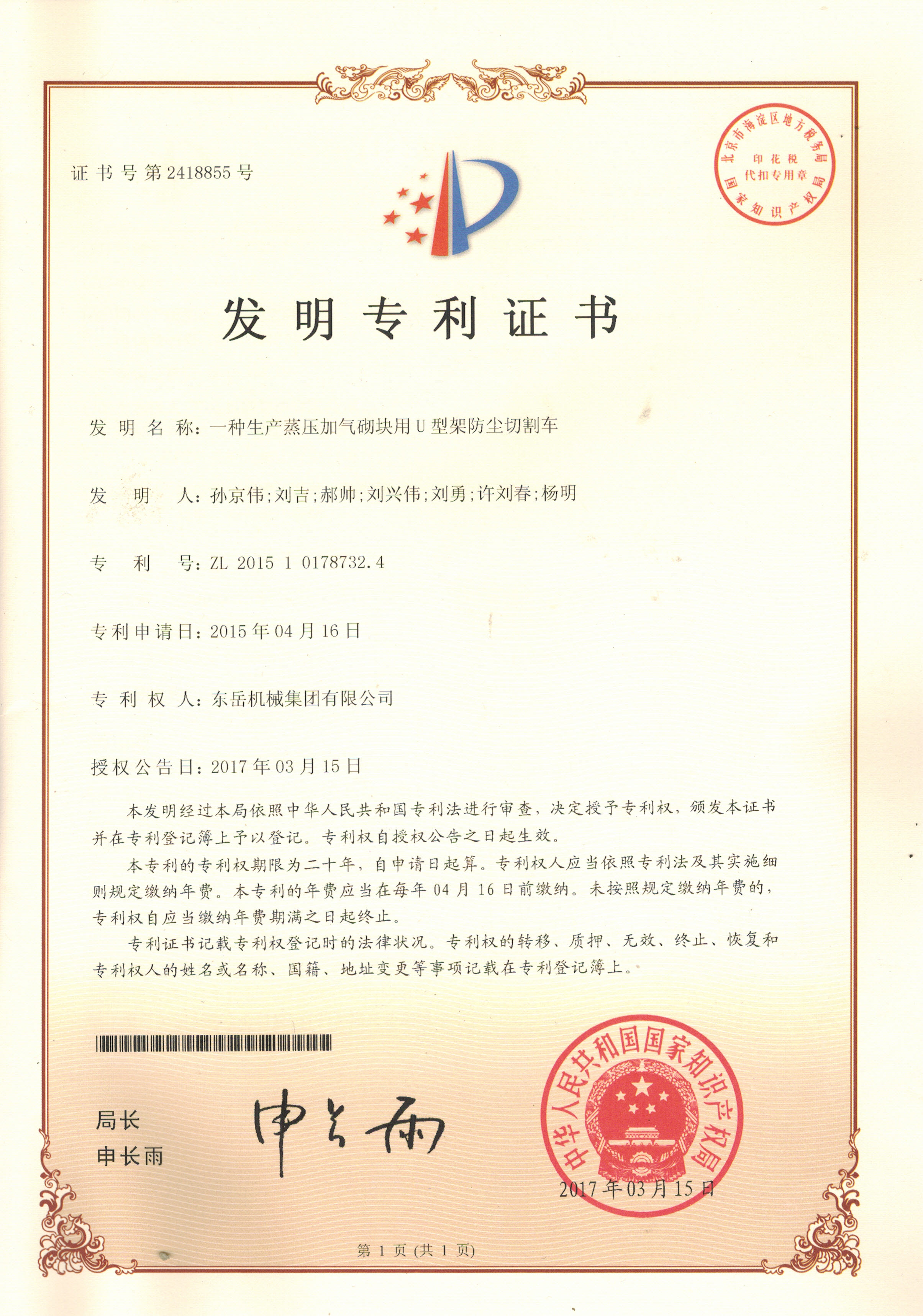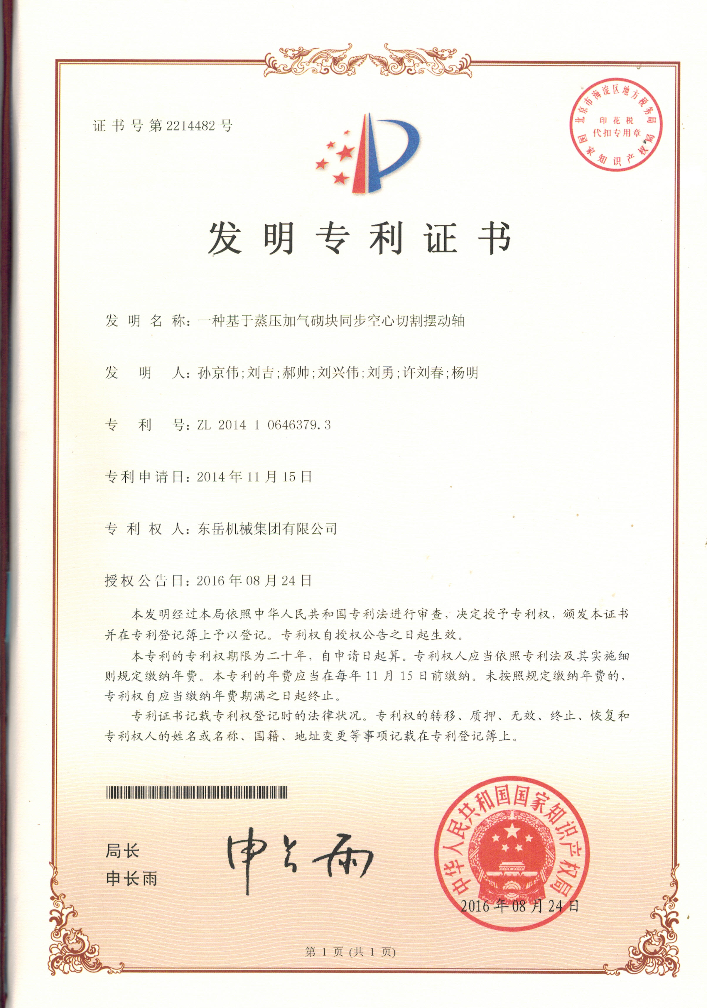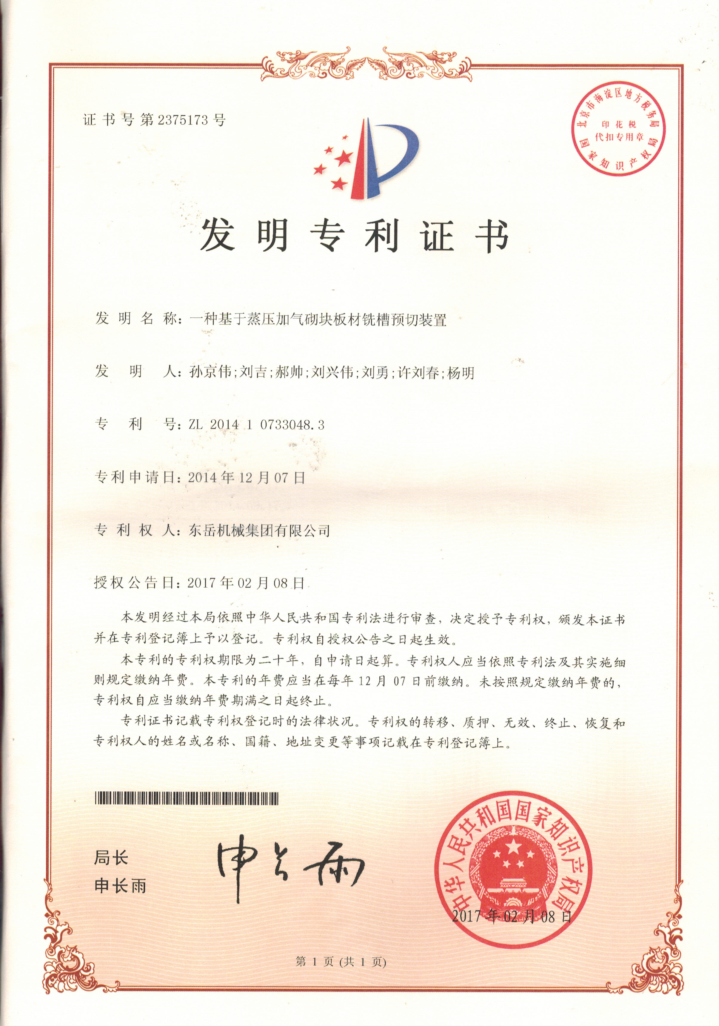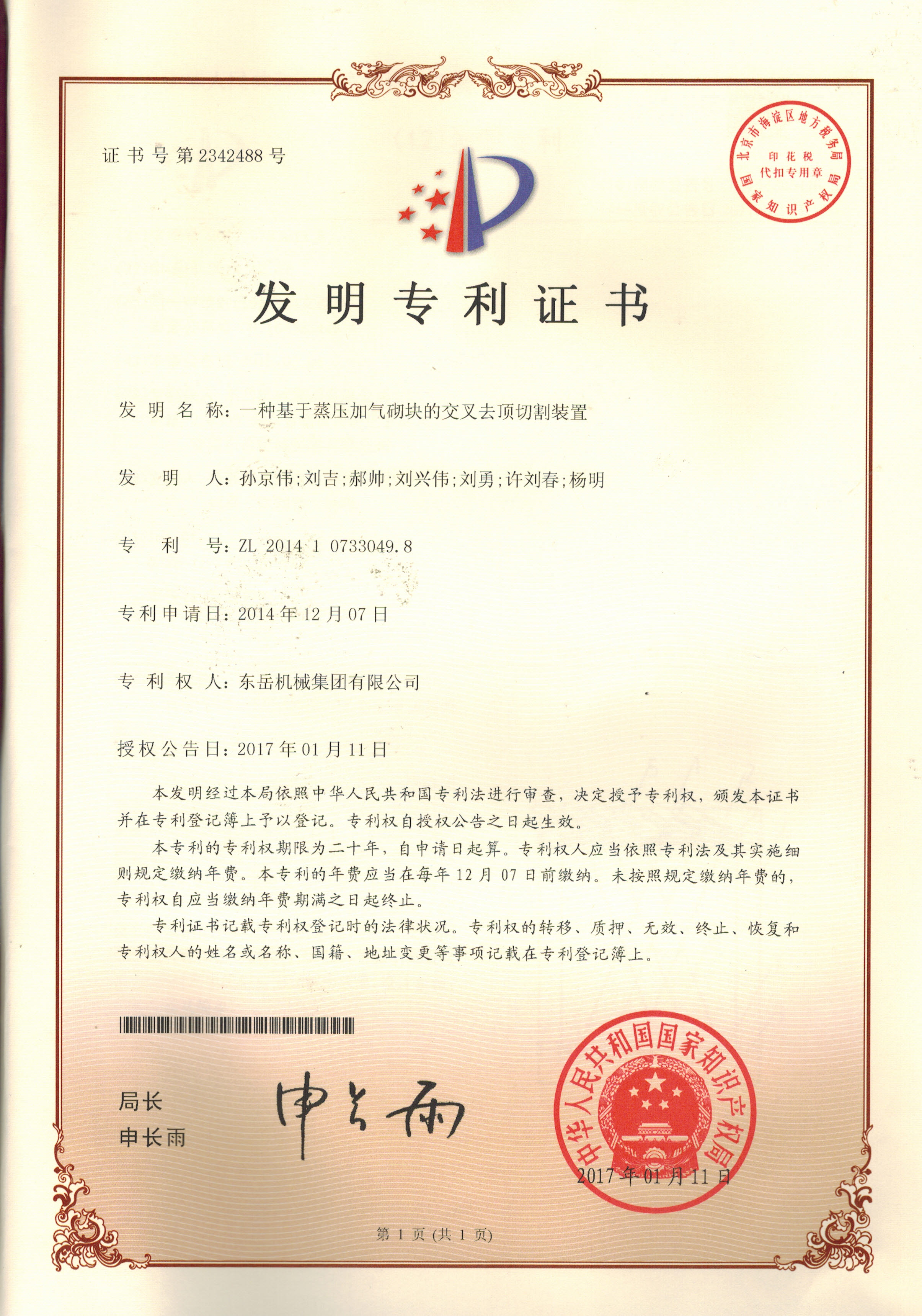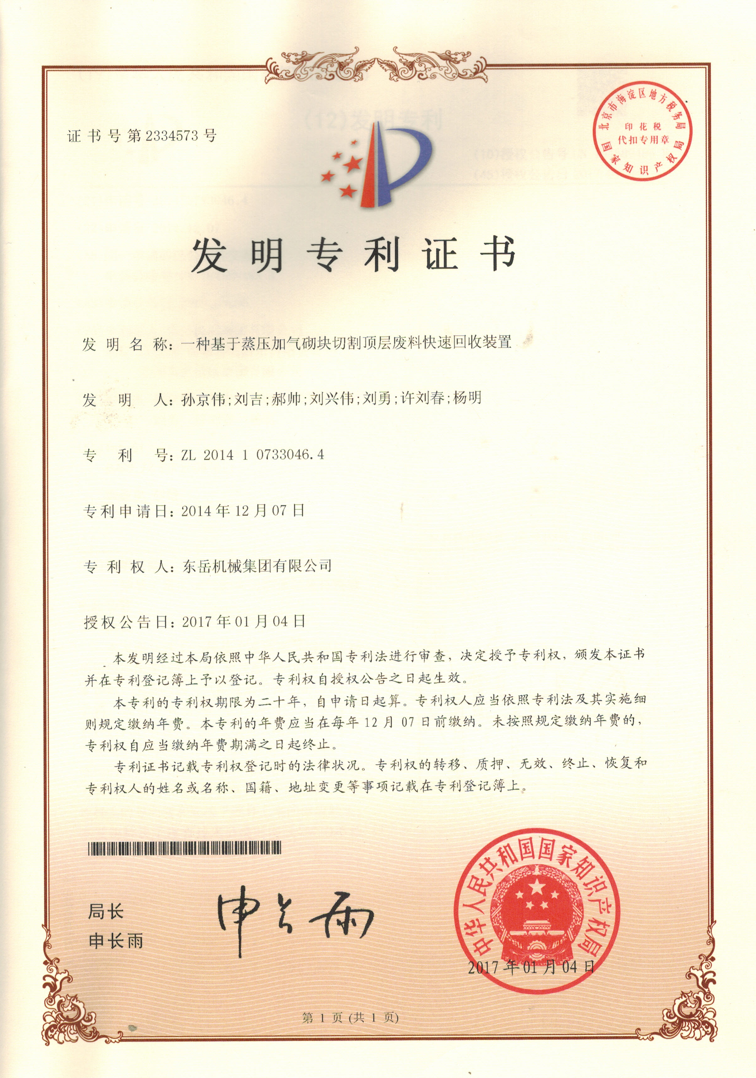 發(fā)明專利證書
